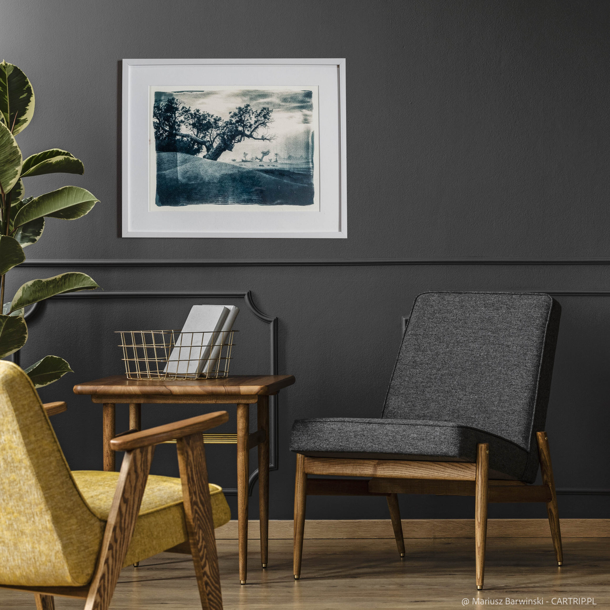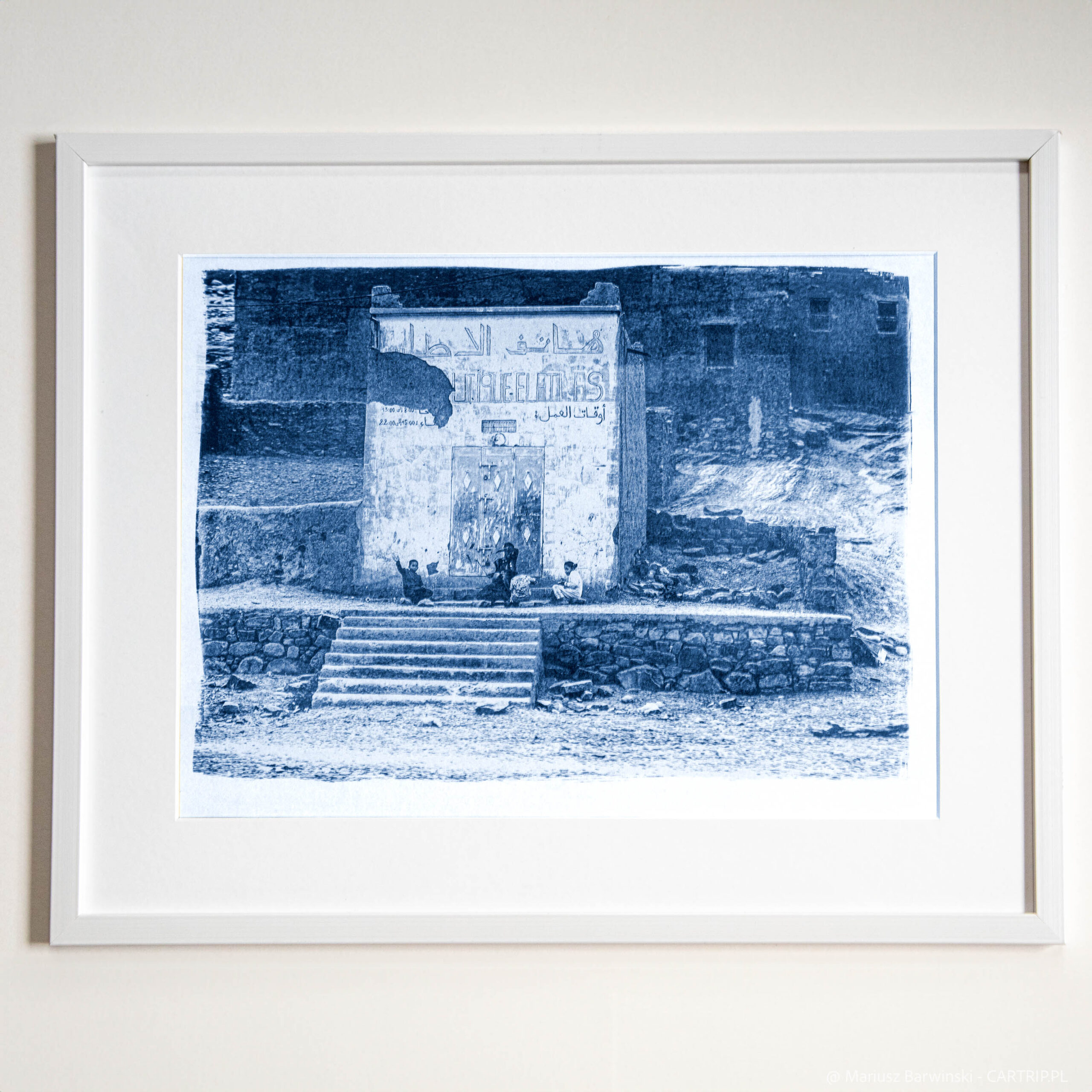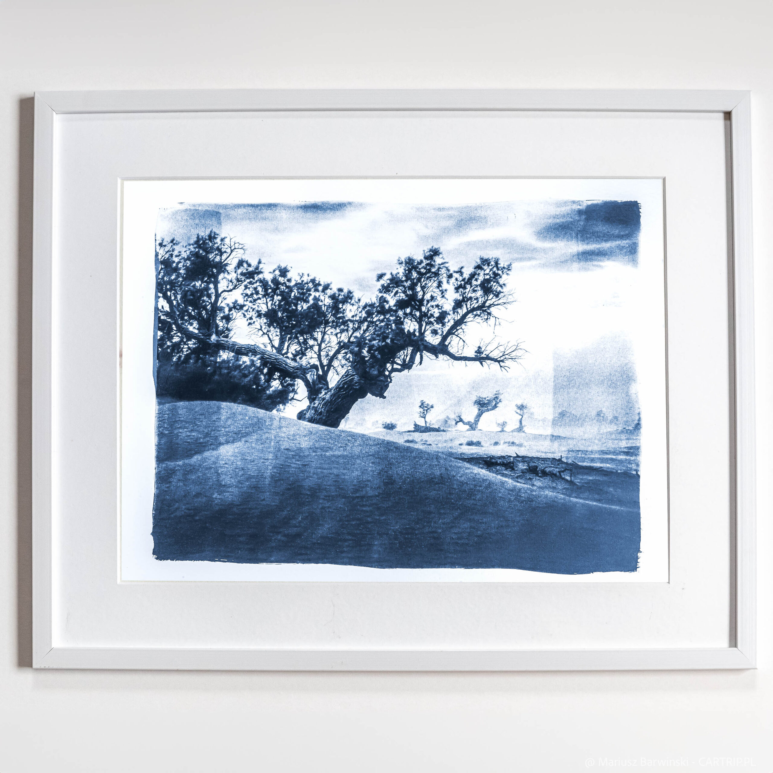 Odbitki zostały wykonane klasyczną metodą cyjanotypii w ciemni, a następnie tonowane w naparach z kawy i suszonych ziół zakupionych na lokalnych targach – co nadało im głęboki, ciepły ton i organiczną nieregularność.