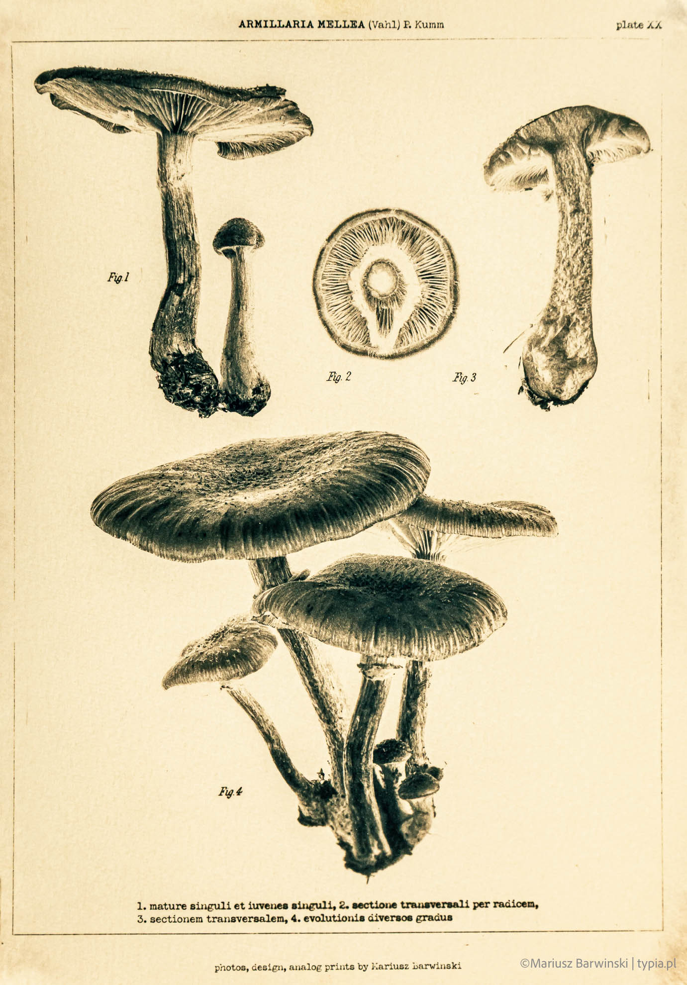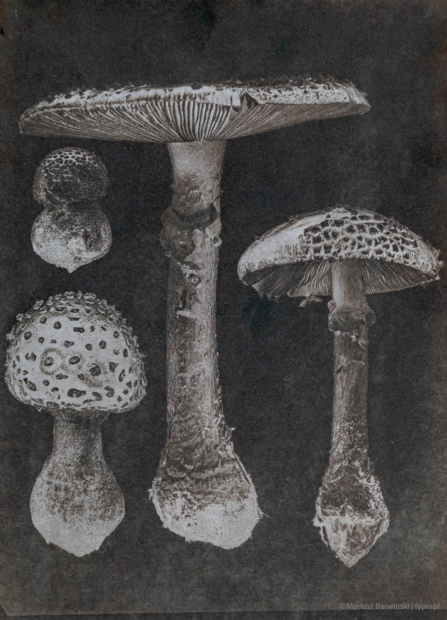 Ta seria to połączenie precyzji cyfrowego kolażu i analogowej alchemii światła. Każdy z prezentowanych grzybów został stworzony jako autorski negatyw, zbudowany z kilku lub kilkunastu fotografii – starannie oświetlanych, warstwowanych i zestawianych w formy przypominające klasyczne ryciny botaniczne. Następnie negatywy zostały przeniesione na papier w technice cyjanotypii, z zachowaniem głębokiego kontrastu i graficznej ekspresji.